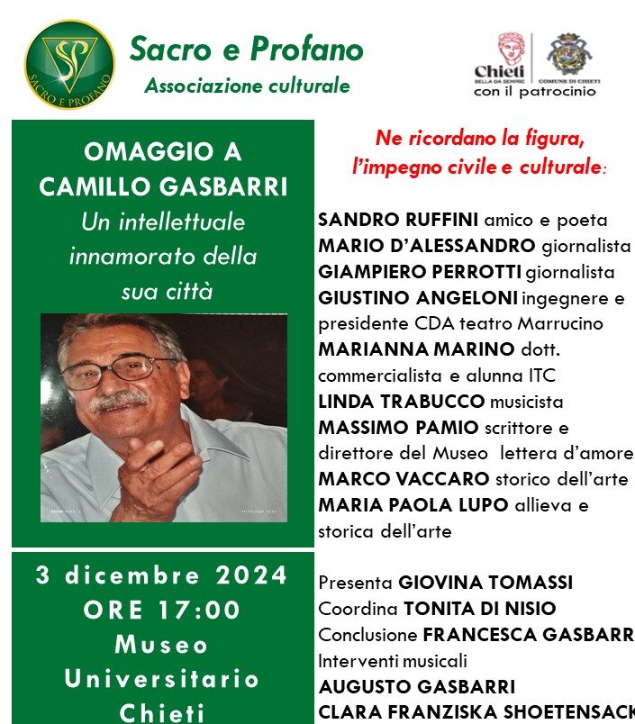 Ricordato dagli organizzatori come “uomo di garbo, disponibile e di raffinata cultura, figura centrale per gli studi storico -artistici della nostra città”. E, ancora: “Le pubblicazioni di storia e di arte di Camillo Gasbarri contribuiscono alla conservazione e alla valorizzazione del nostro patrimonio artistico punto di riferimento per tutti coloro che coltivano la passione per la ricerca. Intellettuale capace di trasmettere il suo sapere con eleganza e di coltivare l’amore per la città di Chieti in tutti coloro che hanno avuto il privilegio di incontrarlo2.