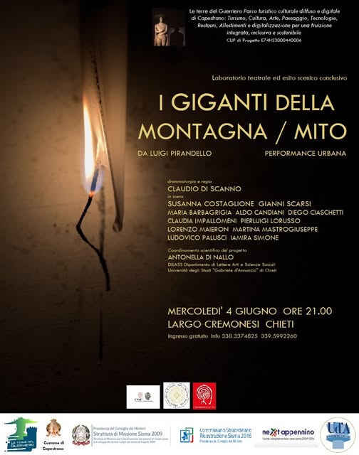 “I Giganti della Montagna / Mito” sarà una performance urbana, ispirata a Luigi Pirandello, che si terrà a Chieti in Largo Cremonesi alle 21:00 del 4 giugno 2020, esito finale del laboratorio teatrale diretto da Claudio Di Scanno