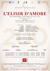 Solida e armonica la messa in scena, con tutti i protagonisti al posto giusto. Preziosa l’Orchestra Sinfonica Abruzzese diretta da Patrick David Murray, impeccabile come sempre il coro del Marrucino. La regia è di Aldo Tarabella; Adina è Gabriella Costa, Nemorino è Ricardo Mirabelli, Belcore è Marcello Rosiello, Dulcamara è Dario Ciotoli, Giannetta è Licia Piermatteo. Spettacolo da non perdere, fortemente raccomandato anche ai giovani che dovrebbero accorrere a frotte per imparare, salendo sulla carrozza donizettiana, ad apprezzare l’opera lirica come merita.