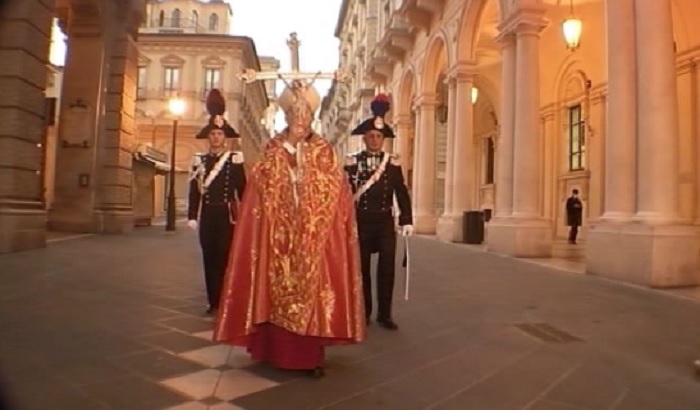 Forte, dopo aver celebrato la messa nella cattedrale di San Giustino, è uscito dalla Cripta con il Crocefisso che ha portato lungo via Pollione, piazza Valignani e su corso Marrucino, illuminato dai tripodi accesi, completamente transennato e con i negozi chiusi. Forte ha, quindi, raggiunto il sagrato della chiesa della SS Trinità da dove ha impartito la benedizione e dove ha trovato ad accoglierlo, in rappresentanza della città, il sindaco Diego Ferrara, il vice Paolo De Cesare e il presidente del Consiglio comunale Luigi Febo. Coloro che abitano lungo il corso hanno seguito la mini processione dalle finestre: in assenza del coro e dei musicisti, le note del “Miserere”- composto dal teatino Saverio Selecchy – sono state trasmesse grazie ad un impianto di filodiffusione attivato anche nella parte bassa della città. Circa 80 persone, tra forze dell’ordine e Protezione Civile, hanno garantito il servizio di ordine pubblico che non ha riscontrato alcun problema. La benedizione di Forte è stata accompagnata dalla preghiera che lo stesso arcivescovo ha scritto dinanzi al Volto Santo di Manoppello e che contiene l’invocazione a Gesù Salvatore “a liberarci da ogni male, e vincere il flagello di questo virus”.