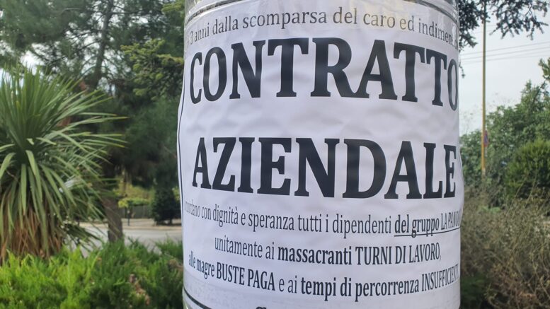 Il manifestino in cui si piange la dipartita del contratto aziendale fa riferimente alla problematiche, tuttora in sospeso, dei lavoratori del’azienda di trasporti La Panoramica.