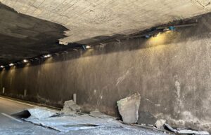 La foto che vedete racconta perfettamente l’accaduto: pezzi del controsoffitto del sottopasso del Tricalle direzione Pescara e Ospedale venuti giù e schivati dalle auto di passaggio