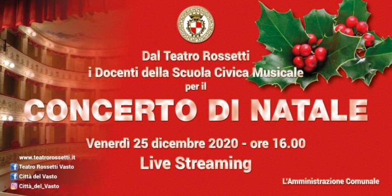 Venerdì 25 dicembre alle ore 16:00 è in programma uno spettacolo dedicato alla cittadinanza attraverso un concerto dal Teatro Rossetti a porte chiuse. Per seguire l’evento basta collegarsi via streaming attraverso la pagina Facebook o Instagram del Comune di Vasto e del sito del Teatro Rossetti (www.teatro.rossetti.it).