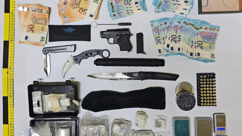 Dopo un breve inseguimento, il conducente è stato fermato e perquisito, negli slip aveva diverse dosi di hashish. Di conseguenza, la perquisizione degli agenti si è estesa al domicilio del giovane, dove era presente anche il fratello maggiore. L’uomo deteneva una pistola scacciacani con canna modificata e idonea al fuoco, due bilancini di precisione, 2500€ in contanti, circa 600 grammi di hashish e materiale di confezionamento.