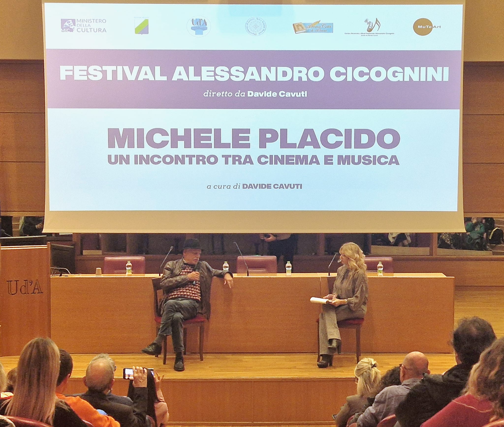A seguire, con la conduzione di Mila Cantagallo, l’indirizzo di saluto del Professore Carmine Catenacci, direttore del DiLASS e del Maestro Davide Cavuti, direttore del “Centro Studi Nazionale Cicognini, e, a seguire, l’introduzione a cura del Professore Antonio Sorella, Direttore scientifico del «Premio Nazionale di Narrativa Città di Penne», istituzione che ha collaborato alla manifestazione. La musica di Alessandro Cicognini è stata la colonna sonora dell’appuntamento. Michele Placido ha ripercorso la sua lunga carriera da attore e regista: l’omaggio al regista di origini pugliesi è iniziato con una clip tratta da “La piovra” per proseguire poi con “Le rose del deserto” di Mario Monicelli. Poi, alcuni dei suoi film più importanti in qualità di regista: “Romanzo criminale” (2005), “Il grande sogno” (2009) e “Vallanzasca gli angeli del male” (2010), nei quali Placido coinvolse il compositore Davide Cavuti, facendolo esordire nel mondo del cinema come compositore di colonne sonore.