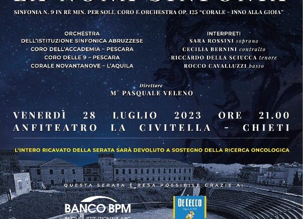 In programma la Nona sinfonia di Beethoven in Re minore. Sul palco 200 musicisti uniti da un alto obiettivo comune: l’Orchestra Sinfonica Abruzzese, il coro dell’Accademia di Pescara, il Coro delle 9 di Pescara, la Corale Novantanove de L’Aquila. Poi i solisti: Soprano: Sara Rossini; Contralto: Cecilia Bernini; Tenore: Riccardo della Sciucca; Basso: Rocco Cavalluzzi. Direttore Maestro Pasquale Veleno. Biglietti disponibili con un contributo di 20 euro alla biglietteria del Teatro Marrucino, oppure su CiaoTickets online e nei punti vendita autorizzati. L’intero ricavato sarà devoluto a sostegno della ricerca oncologica di Fondazione AIRC: www.ciaotickets.com/it/biglietti/sinfonia-n9-di-lv-beethoven-soli-cori-e-orchestra-chieti.