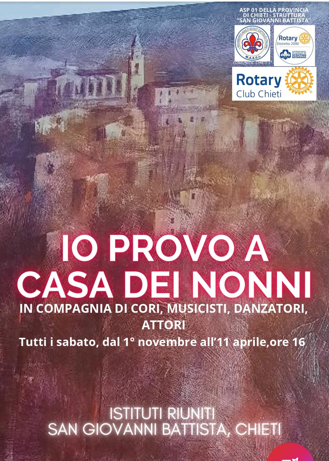 Al via da domani agli Istituti Riuniti San Giovanni Battista di Chieti la Rassegna “Io provo a Casa dei Nonni”. Una iniziativa che si prefigge, ormai da diversi anni, di contribuire ad animare i pomeriggi delle persone qui ospitate. Ad organizzare il tutto sono gli Adulti Scout della Comunità MASCI Chieti 1, il Rotary Club Chieti e l’International Fellowship of Scouting Rotarians (Distretto 2090).