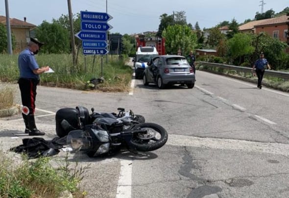 Il conducente della FIAT 500 è un 63enne di Vacri: alla guida della moto un 57enne di Orsogna trasportato al PS di Chieti con plurime fratture. Il centauro non sarebbe in pericolo di vita. Rilievi affidati a Radiomobile e stazioni di Miglianico e San Vito Chietino.