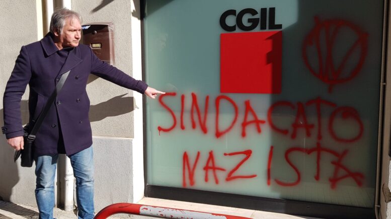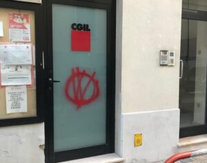 Vandali hanno imbrattato, la scorsa notte, la vetrina e l’ingresso della sede Cgil, Camera del lavoro nel centro storico di Ortona. “Sindacato nazista” è la scritta tracciata con della vernice rossa spray, affiancate da una ‘W’ dentro a un cerchio, sempre di colore rosso, simbolo spesso utilizzato negli ambienti ‘No Vax’.