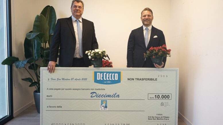 È stato il direttore commerciale della De Cecco, Carlo Aquilano a consegnare a Milano gli assegni a Niccolò Contucci, Direttore Generale Fondazione AIRC e a Monica Ramaioli, Direttore Generale della Fondazione Umberto Veronesi e poi ad Osimo, nella sede della Lega del Filo d’Oro, al Presidente Rossano Bartoli.