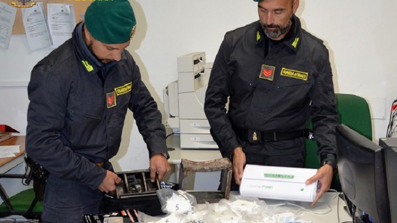 Grazie all’intuito dei finanzieri si è proceduto a fermare il mezzo e ad effettuare una perquisizione meticolosa nel corso della quale è stata rinvenuta una borsa contenente circa 1 Kg di cocaina; i due ragazzi, entrambi italiani residenti nella provincia a bordo del mezzo sono stati tratti in arresto. Lo stupefacente già suddiviso in una dozzina di confezioni, del valore di circa 50 mila euro, era pronto ad essere immesso sul mercato. Nel corso di una successiva perquisizione domiciliare è stato rinvenuto tutto l’occorrente per il confezionamento dello stupefacente, compresi 2 bilancini elettronici di precisione.
