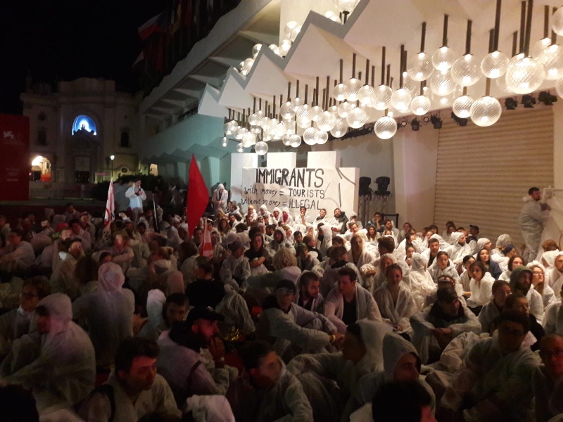 Attivisti abruzzesi del Coordinamento No Hub del Gas partecipano all’occupazione del Red Carpet alla Mostra del Cinema di Venezia per la giustizia climatica.
