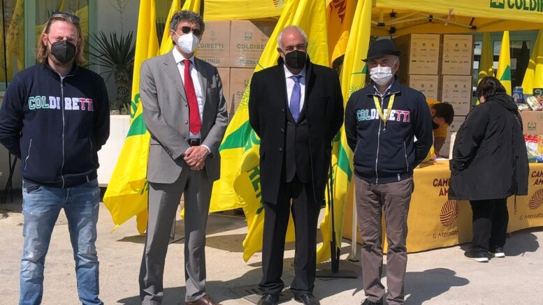Sono 400 i pacchi che, a partire da oggi, verranno consegnati in Abruzzo prima di domenica nell’ambito dell’operazione di solidarietà del sistema agroalimentare italiano per sostenere, in occasione delle festività di Pasqua, le famiglie in difficoltà per l’emergenza Covid, con prodotti alimentari di qualità del nostro Made in Italy. L’iniziativa è stata promossa a livello nazionale da Coldiretti, Filiera Italia e Campagna Amica, con la partecipazione di rilevanti realtà economiche e sociali del Paese e con il patrocinio della Presidenza del Consiglio dei Ministri e in Abruzzo è stata inaugurata questa mattina nel mercato di Campagna Amica di Pescara dal presidente di Coldiretti Abruzzo Silvano Di Primio alla presenza del Presidente della Giunta Regionale Marco Marsilio, del sindaco di Pescara Carlo Masci e del presidente dell’Associazione Agrimercato d’Abruzzo nonché delegato di Coldiretti Giovani Impresa Giuseppe Scorrano e del direttore regionale di Coldiretti Giulio Federici.