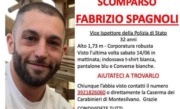 Un poliziotto 32enne di Montesilvano, Fabrizio Spagnoli, è scomparso da alcuni giorni nella zona di Collecorvino