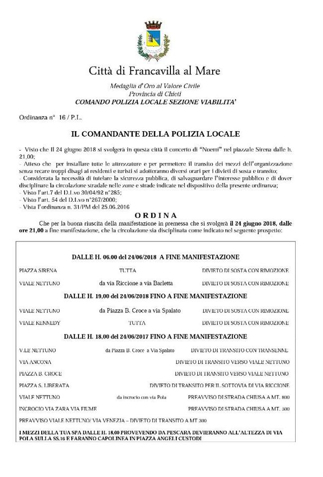 Attese diverse migliaia di persone domenica 24 giugno a Francavilla al Mare per il concerto gratuito di Noemi alle 21 in piazzale della Sirena. Il Sindaco Antonio Luciani ha diffuso l’ordinanza che disciplina la viabilità nella zona anche da diverse ore precedenti. Cambiano anche i percorsi degli autobus. Ecco tutte le disposizioni: