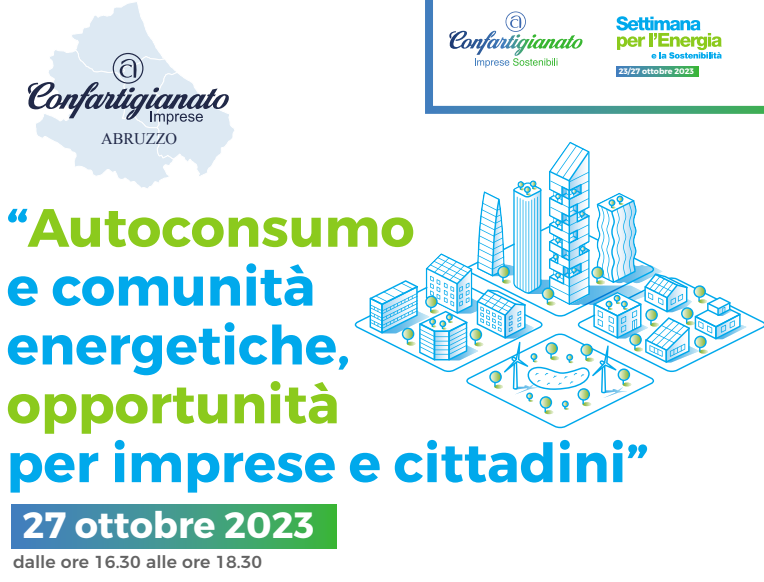 Anche Confartigianato Abruzzo aderisce all’iniziativa con il seminario informativo “Autoconsumo e comunità energetiche, opportunità per imprese e cittadini”, prevista il 27 ottobre dalle 16.30 alle 18.30. Interverranno Loris Rui, direttore del consorzio Caem di Vicenza, e Paolo D’Onofrio, Business Manager Italia presso SolarEdge.