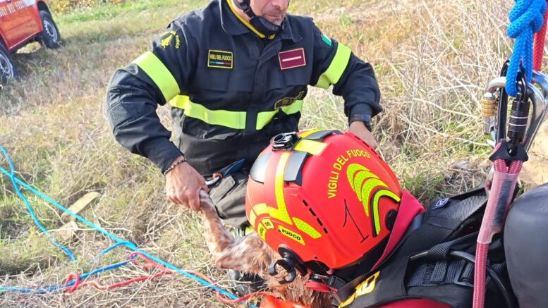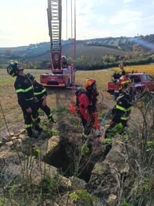 Il cane segugio, mentre era impegnato in una battuta di caccia, è caduto all’interno di un pozzo profondo circa 7 metri, rimasto scoperto e nascosto dalla vegetazione. I vigili del fuoco mentre approntavano l’intervento hanno lanciato una corda al cane che annaspava nell’acqua presente sul fondo del pozzo, in modo che ci si potesse aggrappare con le zampe evitando di affogare.
