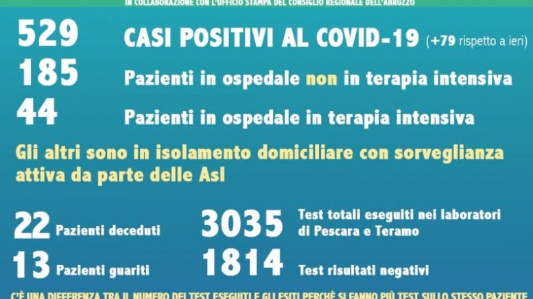 In Abruzzo, dall’inizio dell’emergenza, sono stati registrati 529 casi positivi al Covid 19, diagnosticati dai test eseguiti nel laboratorio di riferimento regionale di Pescara, anche attraverso l’Istituto Zooprofilattico di Teramo. Rispetto a ieri si registra un aumento di 79 nuovi casi.