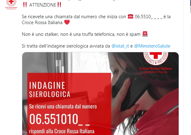 Proseguono le telefonate ai cittadini del campione dei 150.000 individuati dall’Istat e comunicati alla Croce Rossa dal Ministero della Salute. La Croce Rossa Italiana, incaricata delle chiamate, ha incontrato qualche prevedibile difficoltà, viste le tante truffe che prendono di mira i cittadini attraverso il telefono o le innumerevoli chiamate dei call center che cercano di piazzare i loro prodotti. A questo proposito è bene precisare che la chiamata della Croce Rossa Arriva sempre e solo dallo 06 5510 (più i tre numeri finali che servono a localizzare il volontario chiamante). Quindi se a casa o sul cellulare si riceve una telefonata da questo numero si può essere certi che arrivi dalla Croce Rossa, e si può anche verificare ricomponendo il numero.