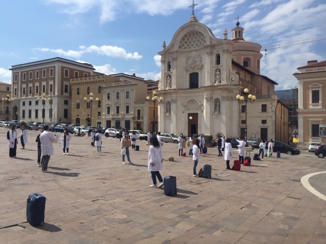 Covid 19 L’Aquila: in piazza Duomo monta la protesta di giovani medici, specializzandi e studenti che chiedono risorse per la sanità pubblica e più posti per le scuole di specializzazione