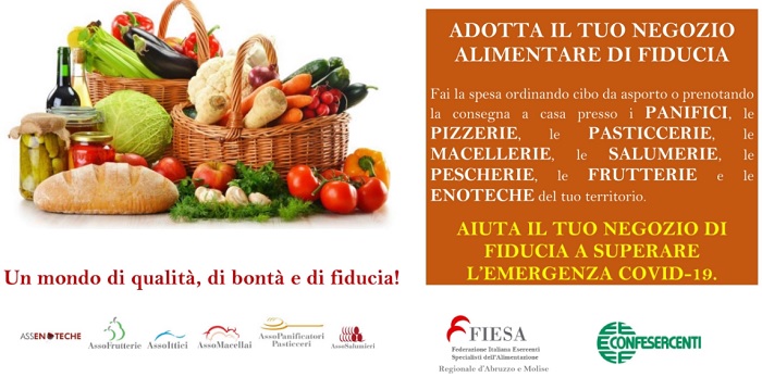 La Fiesa Confesercenti Regionale Abruzzo e Molise, in questo periodo di emergenza Covid-19, lancia l’iniziativa “ADOTTA IL TUO NEGOZIO ALIMENTARE DI FIDUCIA”, utile a sensibilizzare i cittadini in questo momento di grande difficoltà che sta vivendo il settore, attraverso il contatto diretto con i negozi che abitualmente frequentavano prima delle chiusure previste dagli ultimi DPCM. In effetti, con le nuove disposizioni normative messe in atto dal Governo e dalle Regioni, è obbligatoria la chiusura alle 18 di tutte le attività del comparto alimentare. Sono provvedimenti che hanno messo in crisi tutti i settori che la Fiesa Regionale Abruzzo e Molise rappresenta: Panifici, Pizzerie, Pasticcerie, Macellerie, Salumerie, Pescherie, Frutterie ed Enoteche.