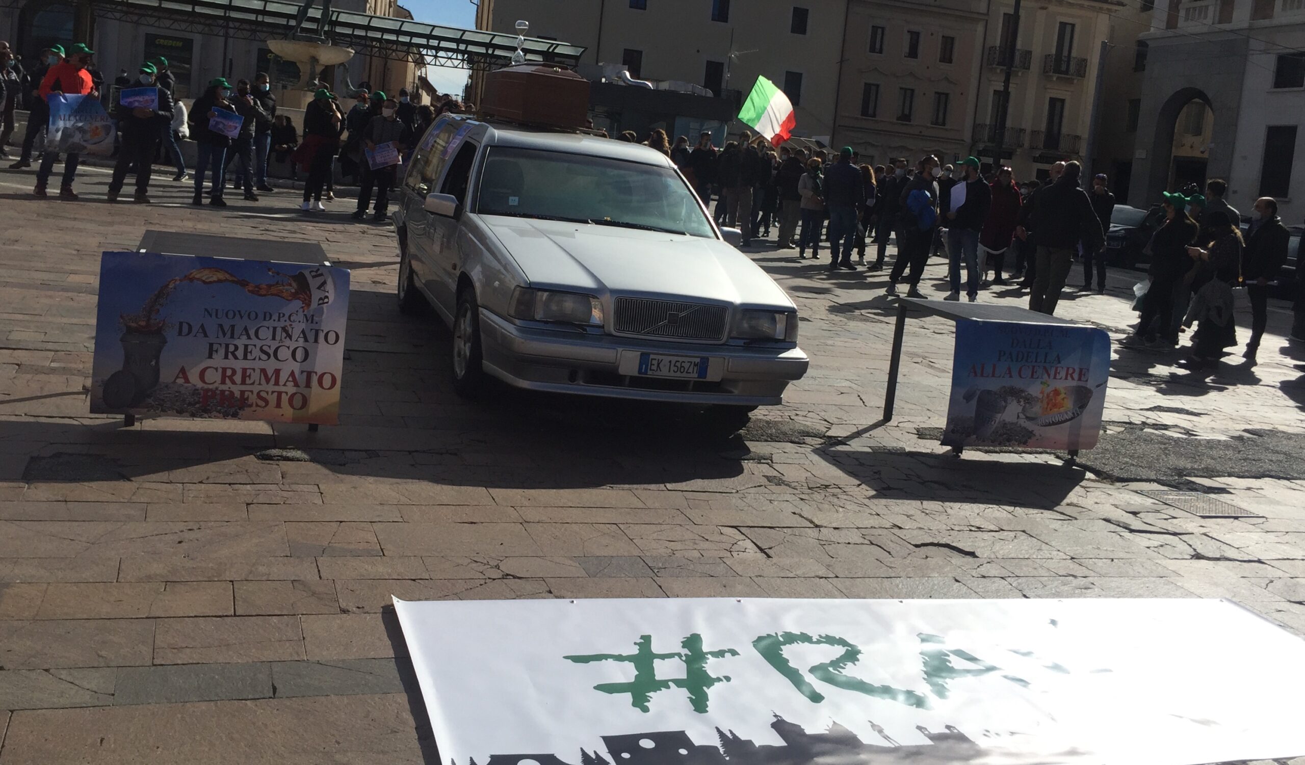 Un carro funebre con un bara sopra con tanto di clessidra a scandire il tempo, padelle e stoviglie suonate in Piazza Duomo per la manifestazione organizzata dall’associazione RAVV, Ristoratori aquilani Vs Virus, tutti minuti di cartelli ironici contro il nuovo Dpcm.