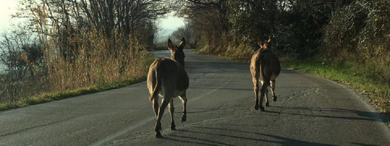 Due asini notati lungo la strada provinciale tra Vasto e Cupello dove, negli ultimi mesi, sono stati registrati i passaggi di branchi di cinghiali.
