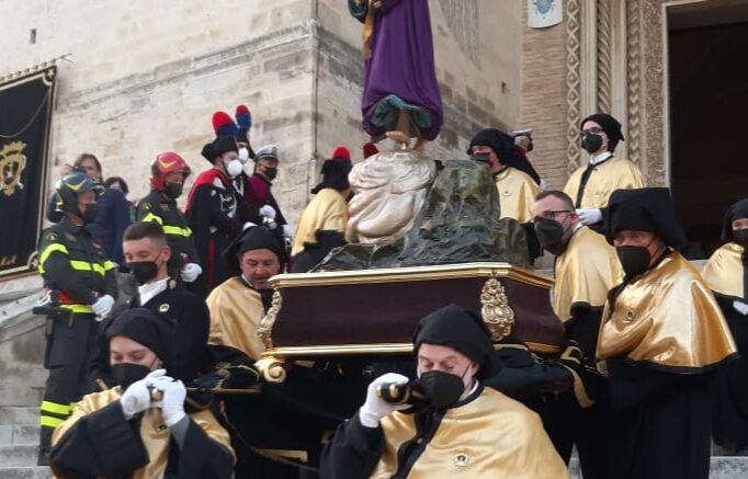 A Chieti, dopo due anni di restrizioni e il cammino solitario dell’arcivescovo Bruno Forte con la croce in braccio, la processione del Venerdì Santo torna al suo antico splendore, seppure ancora con alcune limitazioni dovute alla pandemia. Alle ore 19,30 la processione ha preso il via dalla cattedrale di San Giustino.