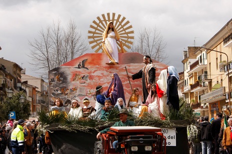 Il “talamo” trasportato a spalla dagli Alpini è stato preceduto dalla sfilata delle canefore e dei doni per Maria SS. del Rifugio alla quale è dedicata la festa. I Talami a Orsogna una volta si facevano così. La sfilata dei quadri biblici viventi, oggi, ha regalato a residenti e turisti un tuffo nel passato, quando questa festa interpretava la devozione popolare di una civiltà contadina fiera delle sue tradizioni. E’ dunque riuscita la scommessa di riportare la sfilata dei Talami al martedì dopo Pasqua, recuperando la tradizione e offrendo ai visitatori dell’Abruzzo un giorno in più di manifestazioni pasquali. Negli ultimi nove anni era stata, infatti, anticipata al lunedì proprio per favorire l’afflusso dei turisti. Nonostante il giorno lavorativo, invece, piazza Mazzini questa mattina era piena di gente, grazie al lavoro svolto dall’Associazione culturale Talami Orsogna, affiancata quest’anno da un Comitato tecnico scientifico che ha contribuito, con l’Amministrazione comunale e le altre Associazioni del paese, a riallacciare i fili della tradizione. “Sono rozzi e talvolta grotteschi, ma pieni di forza e di originalità e devono più alla tradizione e meno al gusto deteriorato di cattive litografie di quanto si possa immaginare”: così nel 1907 la scrittrice e viaggiatrice inglese Anne Macdonell descriveva i Talami che circa un secolo dopo, nel 2011, sono stati riconosciuti “Patrimonio d’Italia per la tradizione” dal Ministero del Turismo. Tema conduttore dei sette carri di quest’anno è stato “Misericordiosi come il Padre”: su ciascun Talamo, davanti al fondale affrescato, attori immobili in costume hanno interpretato scene ispirate alla Bibbia. In alto, davanti a una raggiera, una bambina ha impersonato la Madonna del Rifugio. Sei Talami sono stati posti su carri agricoli e trainati da trattori, il settimo è stato portato a spalla dal Gruppo Alpini Orsogna