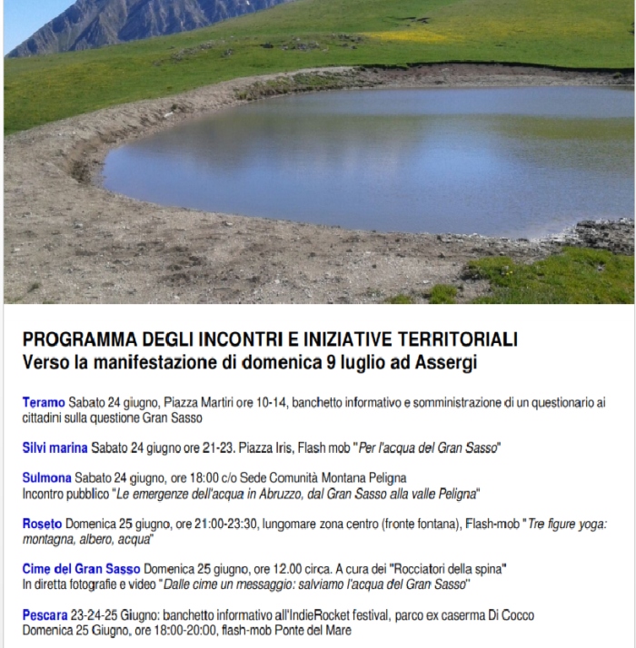 Un calendario fitto di incontri organizzati dal coordinamento per la Mobilitazione per l’Acqua del Gran Sasso, insieme ad attivisti, comitati e singoli cittadini. Al centro dell’attenzione generale ci sono i rischi che riguardano l’acquifero del Gran Sasso, in particolare quelli connessi alle attività nei tunnel autostradali e ai Laboratori di Fisica Nucleare. Flash mob, banchetti informativi, approfondimenti, iniziative rivolte ai bambini, questionari, escursioni in montagna: tre province abruzzesi coinvolte nella mobilitazione per la tutela dell’acqua del Gran Sasso, culminante nella manifestazione di domenica 9 luglio, ad Assergi.