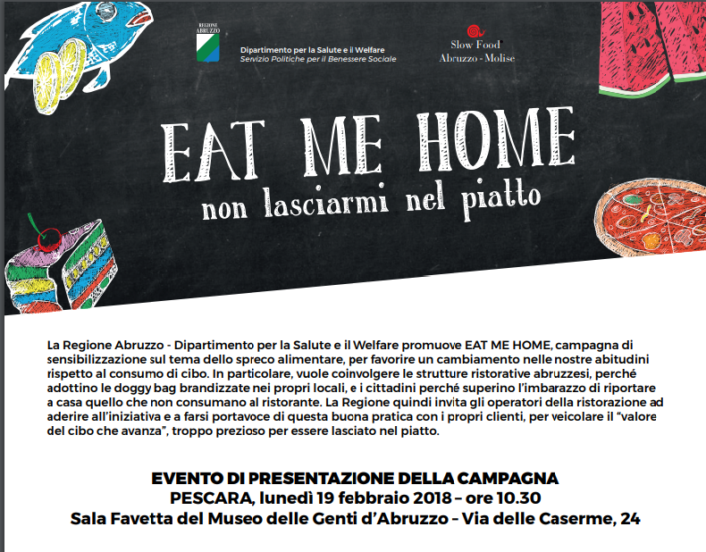 La Regione Abruzzo promuove “Eat me home”: l’iniziativa invita i ristoratori a dotarsi delle doggy bag e sensibilizza i cittadini sul tema dello spreco alimentare.