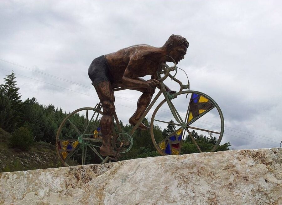 La statua commemorativa era stata istallata sul valico del Salviano alle porte del Santuario della Madonna di Pietraquaria il 18 ottobre 2012, una stata in bronzo che raffigurava il ‘Camoscio d’Abruzzo’, soprannome di Taccone, mentre era in piedi sui pedali. L’opera realizzata