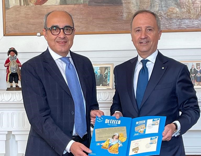 Nell’occasione la Decco ha portato all’Ambasciatore Armando Varricchio il francobollo celebrativo per i 130 negli Stati Uniti di De Cecco: il primo folder del riconoscimento filatelico, emesso un mese fa dal Ministero delle Imprese e del Made in Italy, è stato consegnato all’Ambasciatore dallo stesso direttore Pasquale Galante con una breve cerimonia.