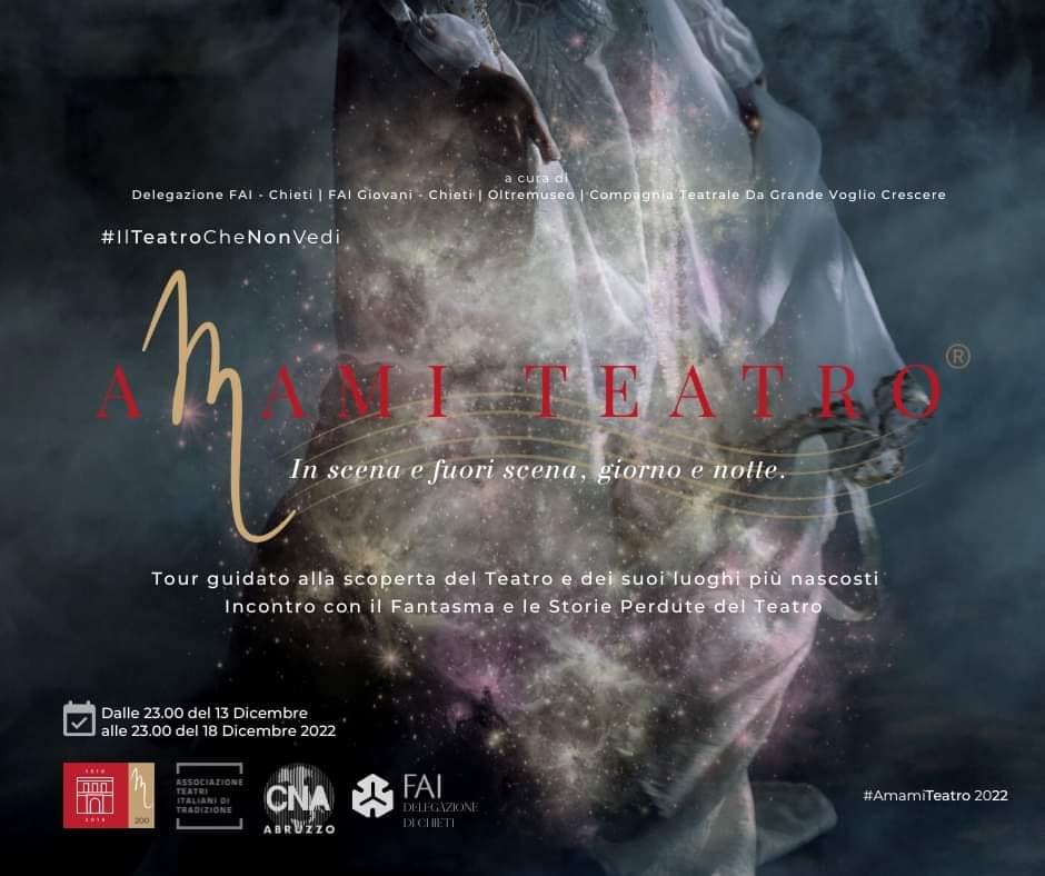 Dopo due anni di stop a causa del Covid-19, torna al teatro Marrucino di Chieti “Amami Teatro – in scena e fuori scena, giorno e notte”. Organizzato dalla Deputazione teatrale, in collaborazione con il Fai-Delegazione di Chieti e il Cna Regione Abruzzo, dal 13 al 18 dicembre musica dal vivo, teatro, yoga, danza, burlesque, proiezioni cinematografiche, lezioni universitarie, seminari, visite guidate, sessioni di trucco scenico e tanto altro