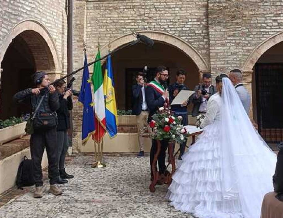 E così due giorni fa la troupe ha girato in piazza Garibaldi quando la sera il promesso sposo ha intonato la serenata, accompagnato da un gruppo folcloristico, sotto al balcone del Palazzo Baronale dove la futura consorte si è affacciata e ha poi ricevuto in dono la ‘Presentosa’, gioiello della tradizione orafa abruzzese. Al momento musicale ha fatto seguito quello conviviale, con castagne, vino e prodotti gastronomici locali, a cura delle associazioni del borgo. Questa mattina, con il coinvolgimento della popolazione e degli invitati, le riprese hanno riguardato il corteo nuziale, il rito civile officiato dal sindaco Matteo Perazzetti e il tradizionale ballo del ‘laccio d’amore’.