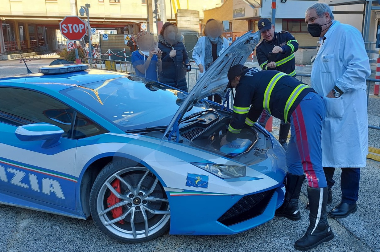 Alle 11 l’arrivo all’Ospedale Civile di Padova per prendere in consegna un organo destinato ad un paziente in attesa al San Salvatore de L’Aquila: un equipaggio della Polizia Stradale ha curato il trasporto in ogni fase grazie ad una performante Lamborghini Huracan appositamente equipaggiata