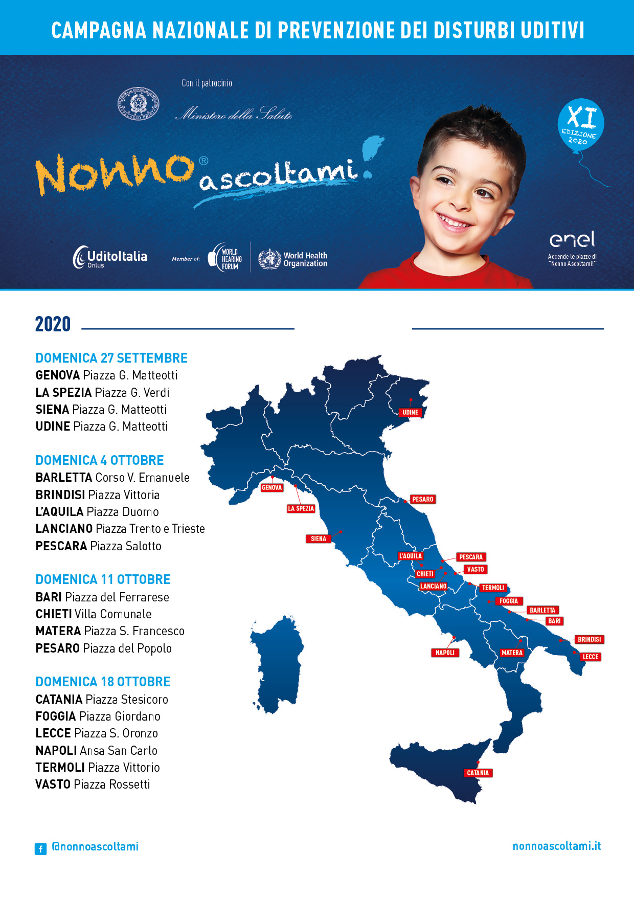 L’11 ottobre sarà volta di Chieti ed il 18 ottobre di Vasto. L’undicesima edizione della campagna è partita il 27 settembre e il programma si snoderà su 4 domeniche (fino al 18 ottobre) coinvolgendo circa 20 piazze con medici specialisti e tecnici dell’udito che per un’intera giornata saranno a disposizione dei cittadini nelle piazze di riferimento.