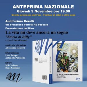 “Le grandi cose cominciano da un vuoto, da una mancanza”: proprio in questo modo nasce “La vita mi deve ancora un sogno” – Storia di Billy (Masciulli Edizioni), il nuovo libro del giornalista pescarese Luca Pompei che verrà presentato in anteprima al Fla di Pescara, giovedì 9 novembre alle ore 19.00, presso l’Auditorium Cerulli.
