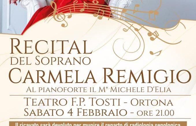 Sabato prossimo, 4 febbraio, il soprano pescarese Carmela Remigio tornerà a cantare nel suo Abruzzo dopo oltre dieci anni dal suo ultimo concerto. La serata è organizzata dal Lions club di Ortona ed è in programma al teatro Francesco Paolo Tosti, con inizio alle 21. Il ricavato sarà utilizzato per munire il reparto di Radiologia senologica dell’ospedale Bernabeo di Ortona di un impianto di filodiffusione