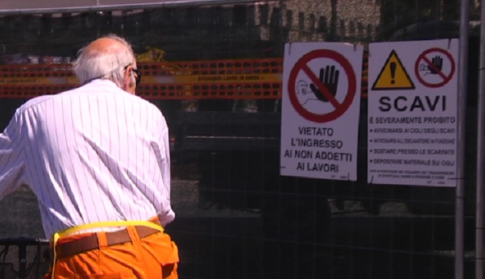 Transennata in piazza Salotto l’area nella quale sorgerà la nuova fontana musicale-luminosa voluta dall’amministrazione Masci. Curiosità soprattutto tra i pensionati veri supervisori!