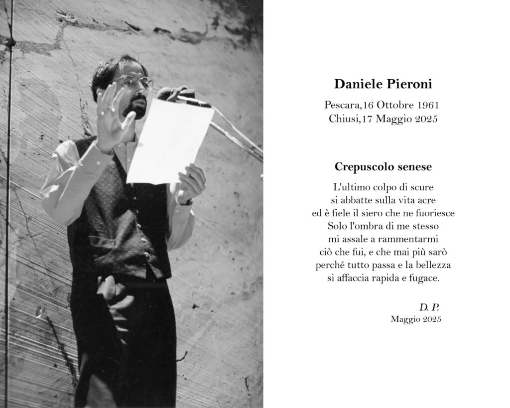“Daniele – prosegue ancora Mario Pieroni nell’intervista – è sempre stato un figlio particolare: era sempre ligio ai suoi doveri, ai suoi compiti. Dotato di un enorme senso di responsabilità, in tutto. Ha vissuto i suoi ultimi giorni con grandissima dignità. Non è scontato in quella condizione. Ci aveva anticipato la sua scelta, come avrà già compreso. Ma ho capito che il tempo era avvenuto solo quando mi ha mandato la sua ultima poesia. Mi è arrivata via Whatsapp. Un trillo del telefonino. Poi ho letto quel primo verso: ‘L’ultimo colpo di scure/si abbatte sulla vita acre’. Quello per me era un messaggio di un figlio, ma capivo allo stesso tempo che era anche l’addìo di un poeta”.