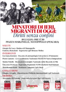 Dopo i saluti del sindaco di Manoppello, Giorgio De Luca, e di Federica Benedetti della segreteria Cgil Abruzzo Molise, interverranno Lia Giancristofaro, docente di antropologia all’Università d’Annunzio, Pietro Lunetto, co-coordinatore nazionale Filefets Nuova Emigrazione, Mattia Vitiello, ricercatore del Consiglio Nazionale delle Ricerche (Cnr), Vincenzo Pestieau, segretario regionale Fgtb Charleroi Sud Hainaut, Abdelhamid Hafdi, mediatore culturale Cgil Chieti. Le conclusioni saranno affidate a Filippo Ciavaglia, del Dipartimento Politiche internazionali della Cgil nazionale. Il dibattito sarà moderato da Alessandra Di Simone, segretaria generale Spi Cgil Pescara.