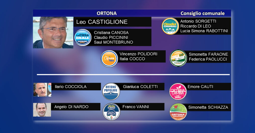 La squadra di Castiglione è composta da cinque liste civiche: Cittadini Consapevoli, Forza Leo per Ortona, Il Comune delle Idee, La città ideale e Ortona Civica.