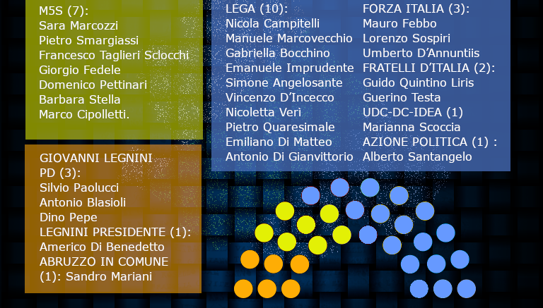 In minoranza 7 consiglieri del MoVimento Cinque Stelle, ed il secondo candidato presidente Giovanni Legnini, nella cui coalizione sono eletti 3 consiglieri del Pd, due della lista “Legnini presidente” e uno della lista “Abruzzo in comune”.