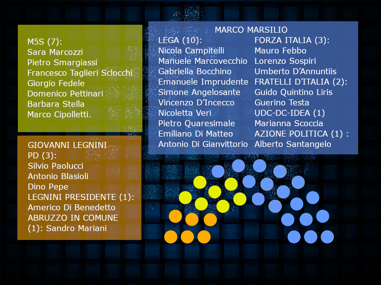 Con il presidente eletto Marco Marsilio, in maggioranza entrano 17 consiglieri di maggioranza: 10 della Lega, 3 di Forza Italia, 2 di Fratelli D’Italia e uno ciascuno di UDC-DC-IDEA e Azione Politica.