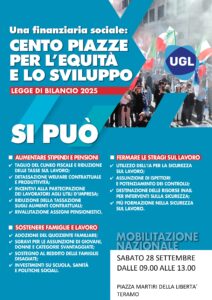 Domani, 28 settembre, l’Ugl in piazza Martiri a Teramo nell’ambito della mobilitazione “Cento piazze per l’equità e lo sviluppo”