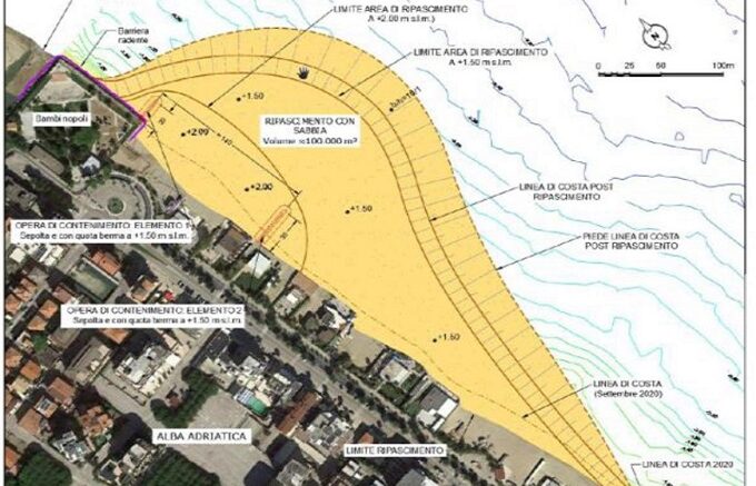 Osservazioni relative all’opera da due milioni di euro con l’intento di mettere in sicurezza dalle mareggiate e dall’erosione, la costa nord di Alba Adriatica. L’intervento prevede un corposo ripascimento e due pennelli insabbiati a protezione della nuova sabbia. Una parte degli operatori turistici di Alba adriatica è d’accordo con quest’opera e sottolinea la necessità di strutture rigide di contenimento mentre l’altra vuole solo un ripascimento.