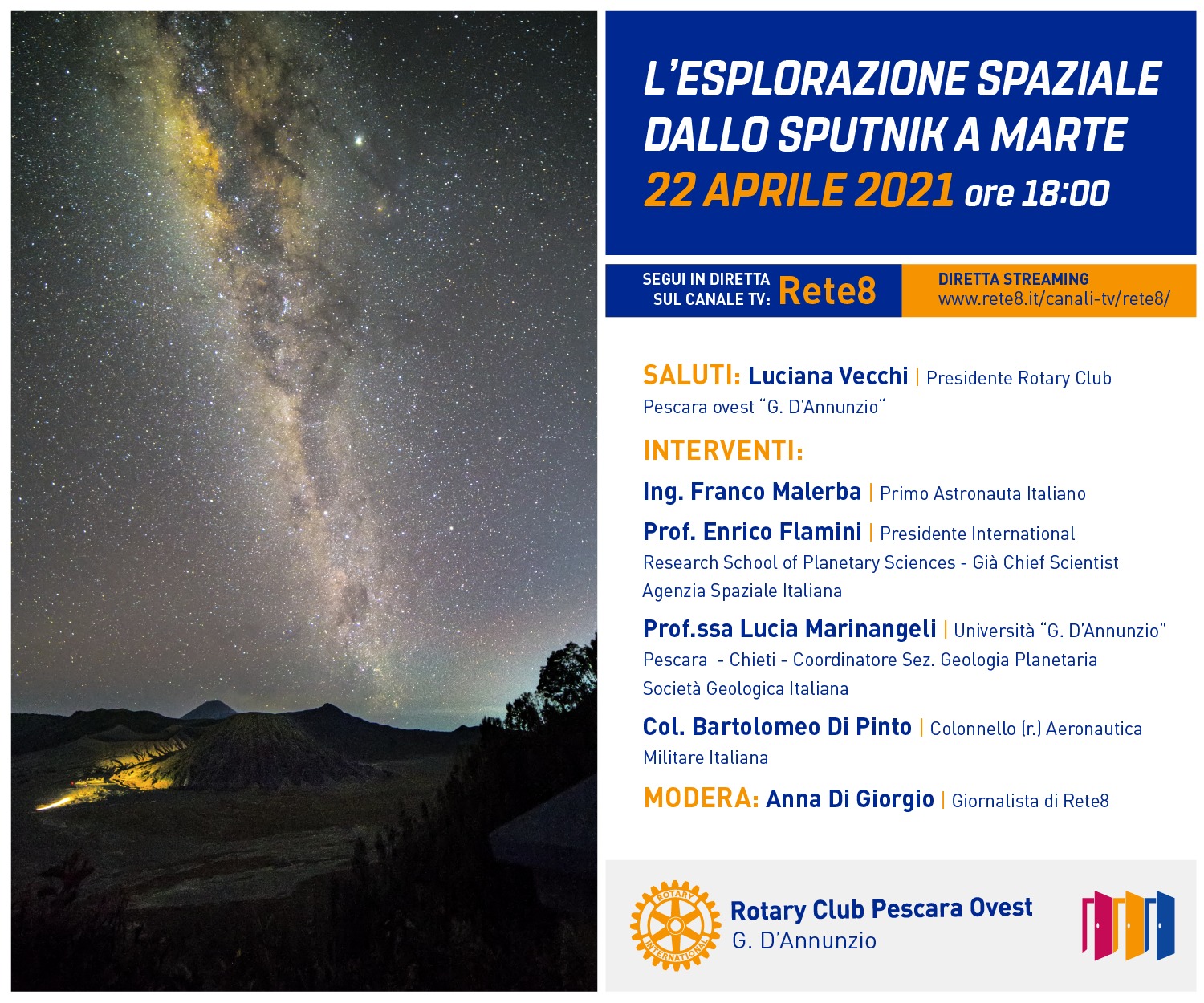‘Esplorazioni spaziali: dallo Sputnik a Marte e oltre’. Se ne parlerà giovedì nella diretta televisiva che andrà in onda a partire dalle ore 18 su Rete8 (canale 10 del digitale terrestre) e in streaming sul sito www.rete8.it . L’evento, organizzato dal Rotary club Pescara ovest G. d’Annunzio, prende spunto dalla pubblicazione del libro “Dallo Sputnik a Marte e oltre”, edito da Youcanprint e scritto da Bartolomeo Di Pinto, Lucia Marinangeli ed Enrico Flamini.