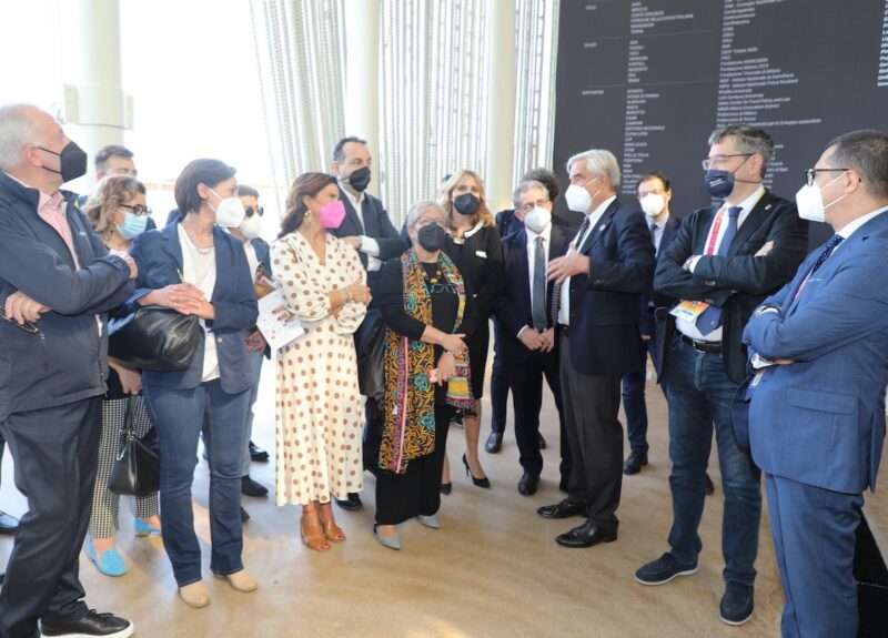 La delegazione abruzzese, guidata dall’assessore alle Sviluppo economico e al Turismo Daniele D’Amario, è stata accolta dal commissario generale dell’Italia a Expo 2022, Paolo Glisenti, che ha condotto i delegati abruzzesi negli spazi del padiglione Italia, interessati per una parte dalla mostra dell’arte orafa abruzzese.