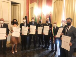 La mattinata è proseguita con la consegna di 22 onorificenze ad altrettanti cittadini di Pescara e provincia che si sono distinti per elevati meriti culturali e civili. Croce d’Onore, conferita al Caporal Maggiore Scelto Jonni D’Andrea (Sottufficiale dell’Esercito Italiano in congedo, residente a Montesilvano) con decreto del Presidente della Repubblica in data 21 maggio 2020, distinzione onorifica attribuita alle vittime di atti di terrorismo o di atti ostili impegnate in operazioni militari e civili all’estero, nonché le onorificenze “Al merito della Repubblica Italina”, conferite con decreto del Presidente della Repubblica del 27 dicembre 2019/2020, ai cittadini residenti nella provincia di Pescara, che si sono particolarmente distinti per elevati meriti civili e culturali, di seguito elencati :
